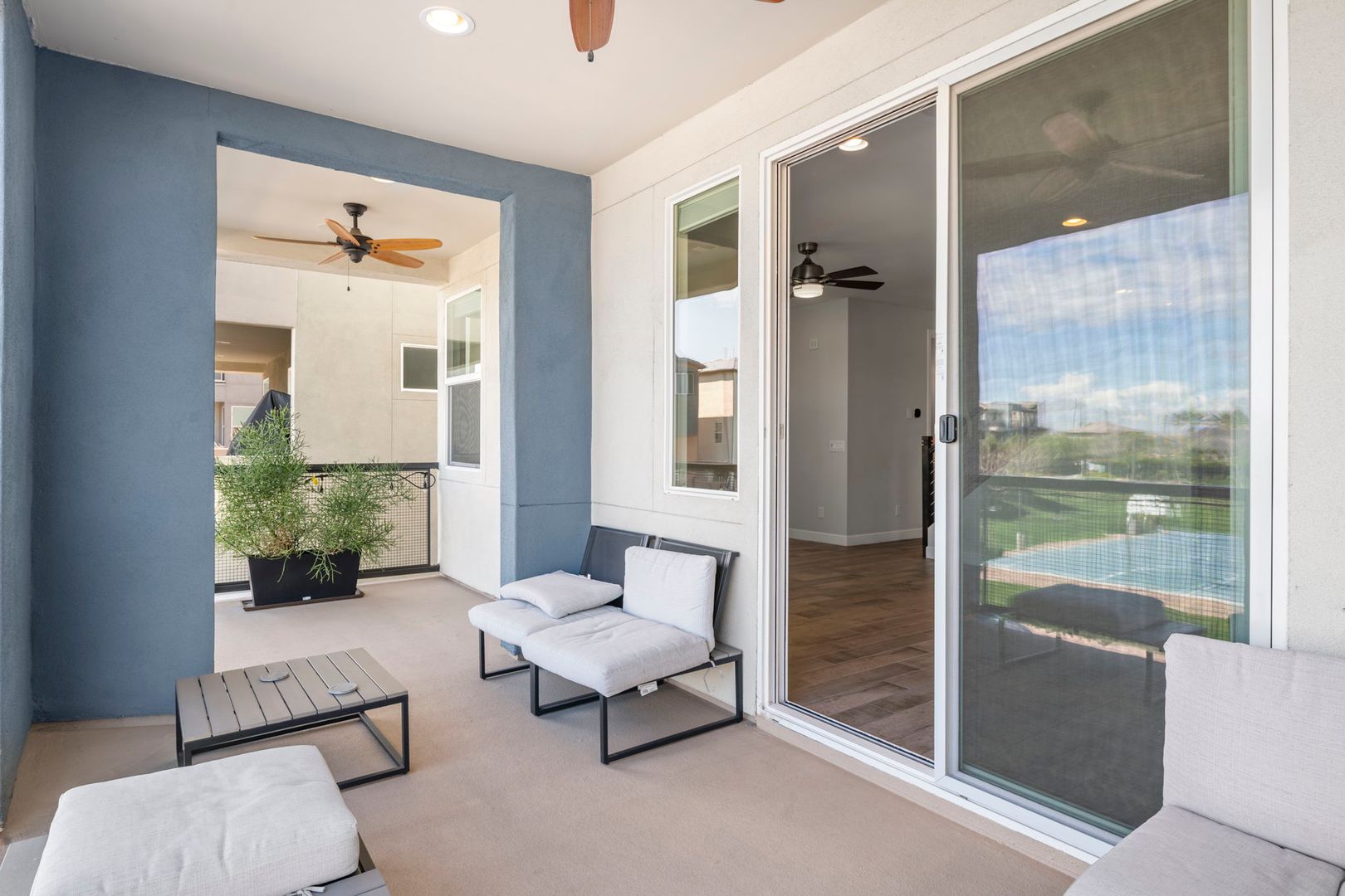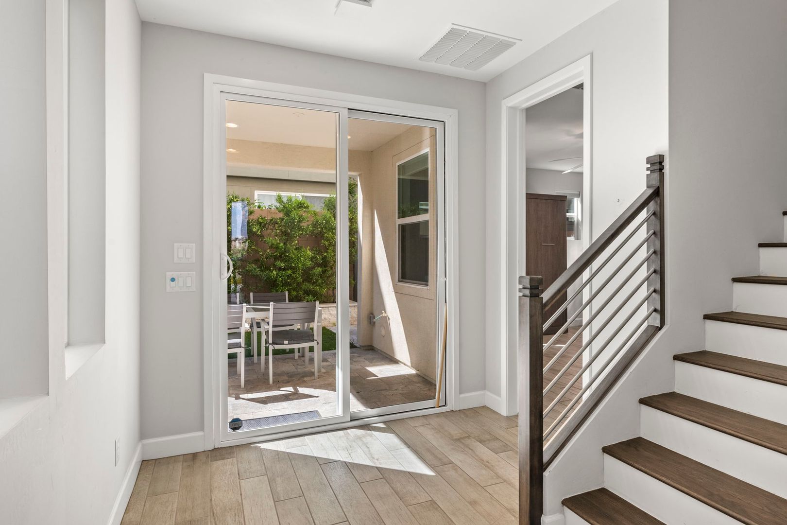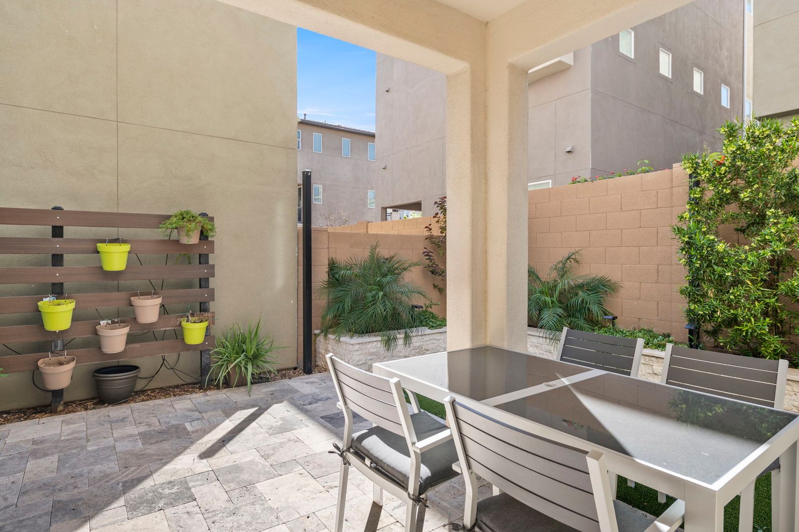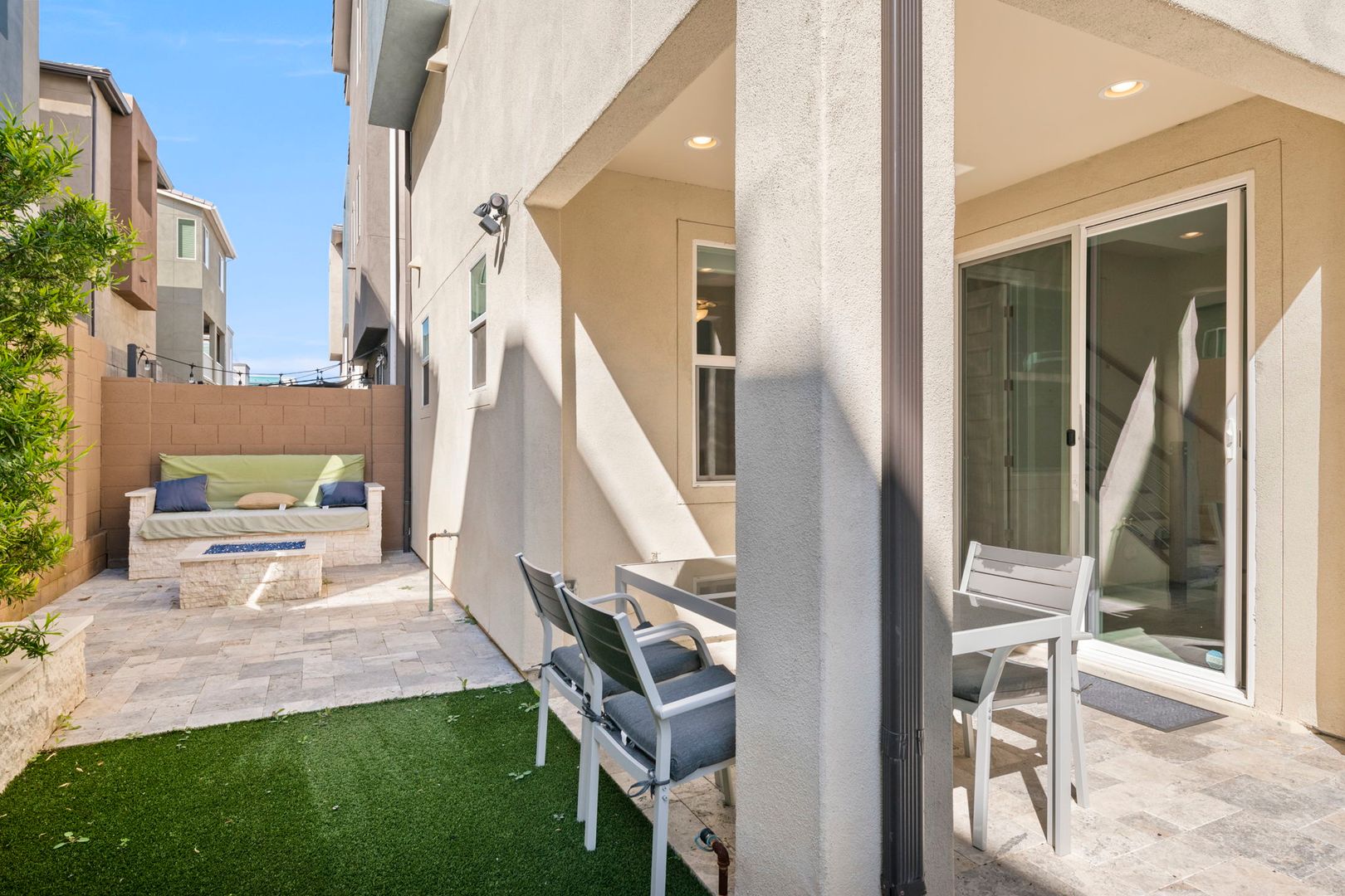 This gorgeous 3 Bedroom, 3.5 Bath home is located in the resort style gated Rhythm Community. The home faces the park, has natural light & modern features, is completely customized with NO CARPET, 9 foot doors, built in surround sound in the living room, and built in speakers, fans and lights on the balcony. The kitchen boasts high end appliances and a custom oversized island. The primary bedroom 's luxurious en suite bathroom features a complete tile shower with a rainfall feature. The in law suite has murphy bed and built in desk. The garage has overhead storage and is pre-wired for 220V EV chargers. Private backyard w/ faux grass, built in fireplace & easy care landscape. Community has heated pool, spa and workout facility. Easy access to shopping and fwy. Please call for pets.