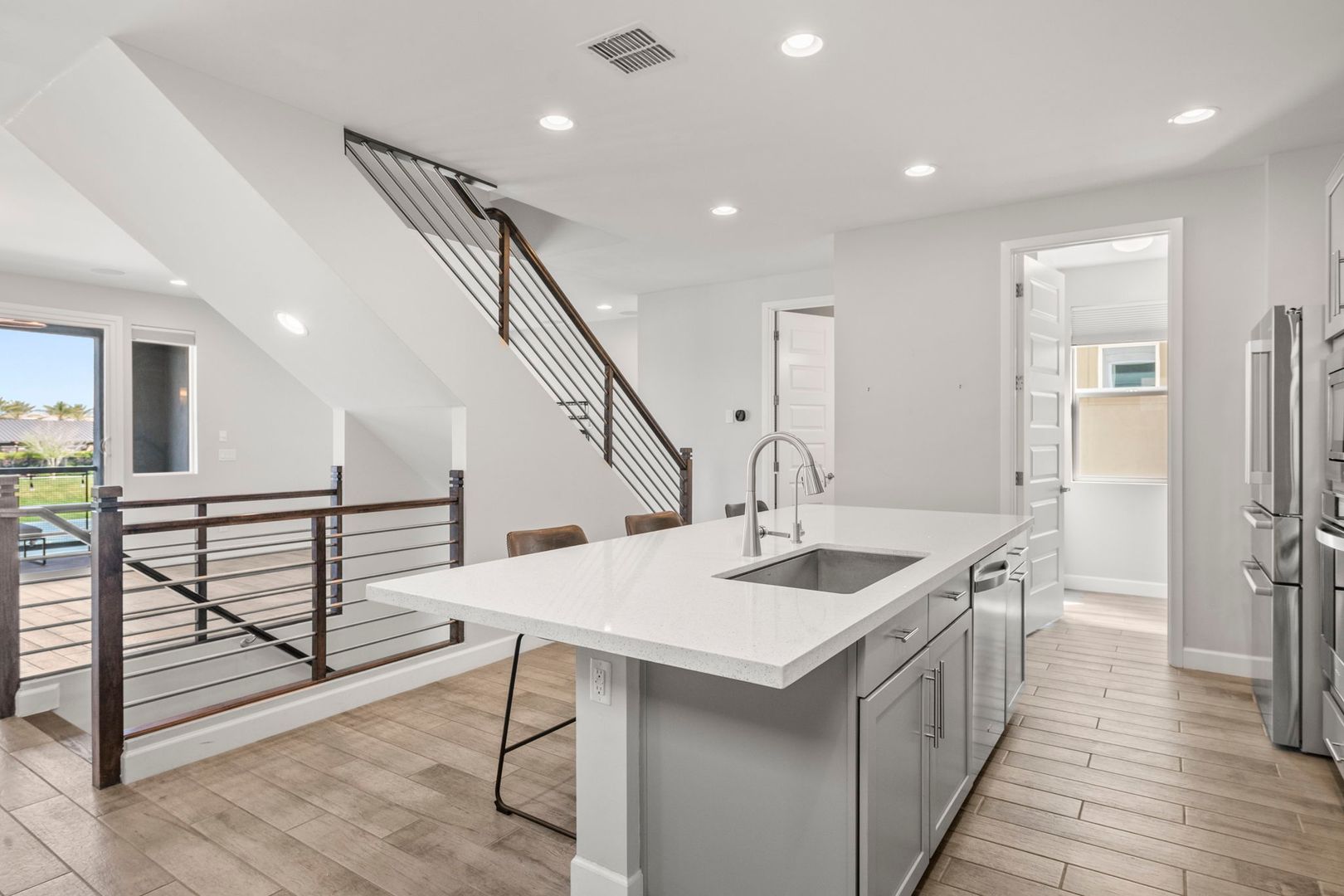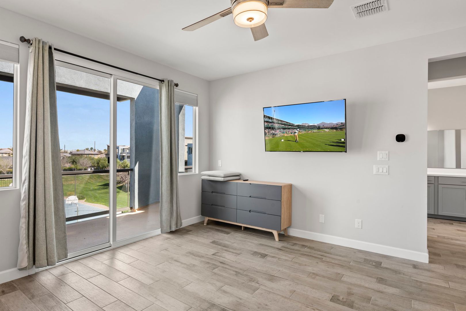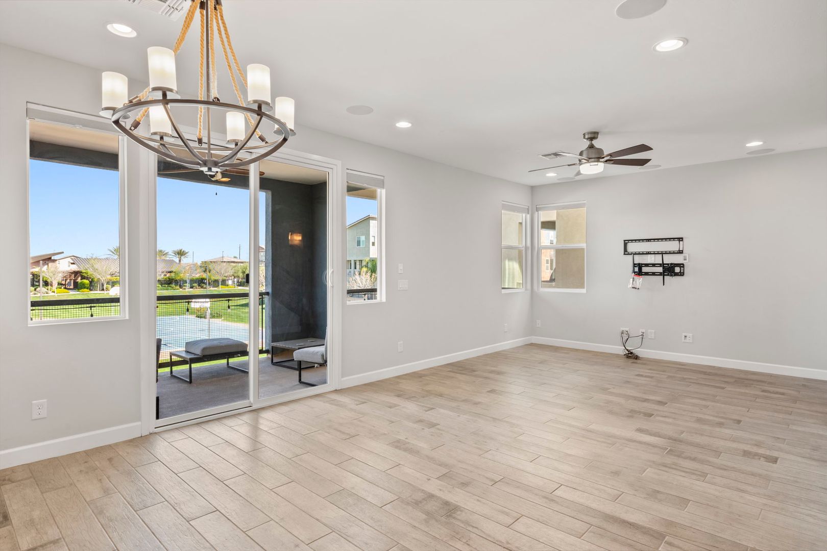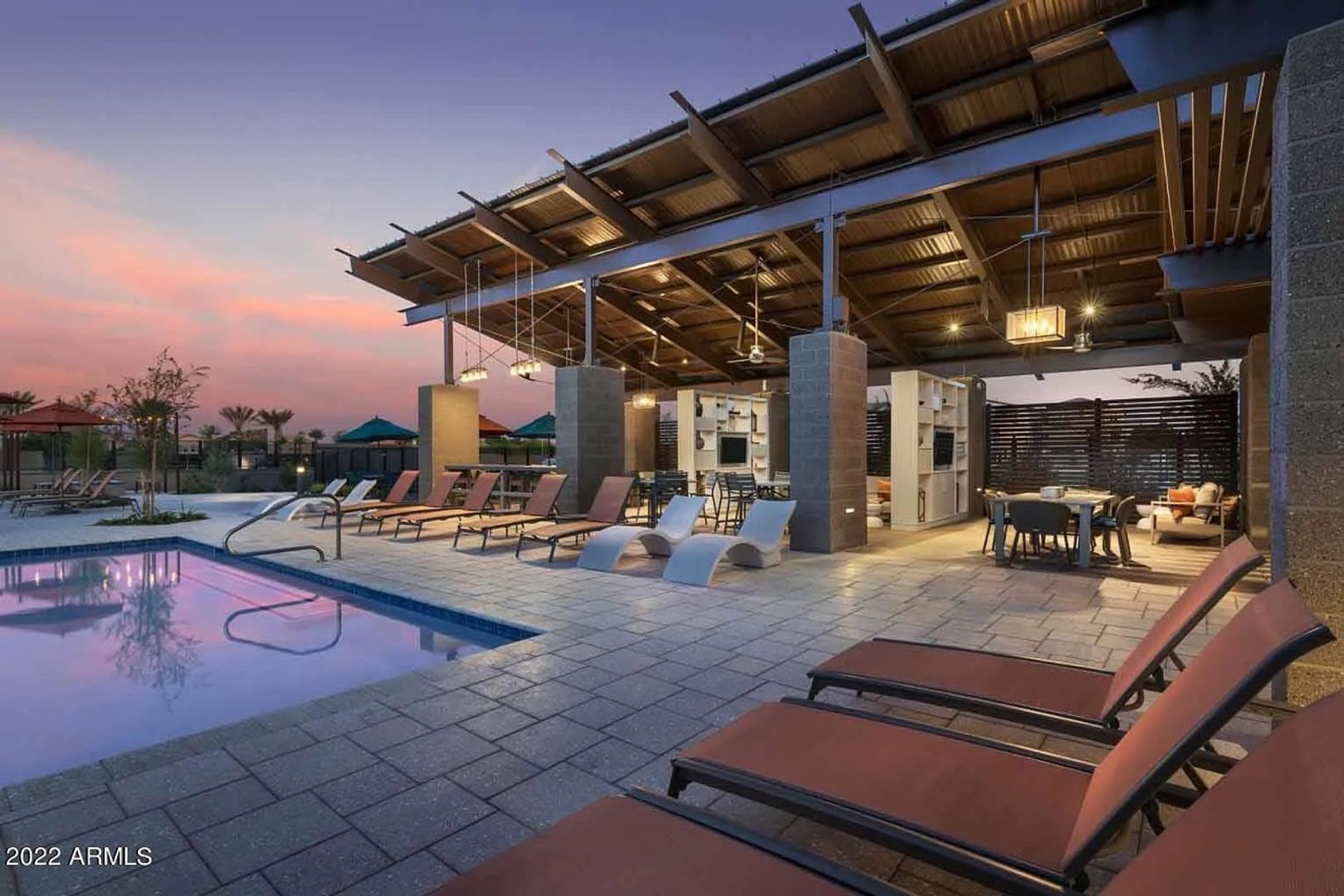 This gorgeous 3 Bedroom, 3.5 Bath home is located in the resort style gated Rhythm Community. The home faces the park, has natural light & modern features, is completely customized with NO CARPET, 9 foot doors, built in surround sound in the living room, and built in speakers, fans and lights on the balcony. The kitchen boasts high end appliances and a custom oversized island. The primary bedroom 's luxurious en suite bathroom features a complete tile shower with a rainfall feature. The in law suite has murphy bed and built in desk. The garage has overhead storage and is pre-wired for 220V EV chargers. Private backyard w/ faux grass, built in fireplace & easy care landscape. Community has heated pool, spa and workout facility. Easy access to shopping and fwy. Please call for pets.