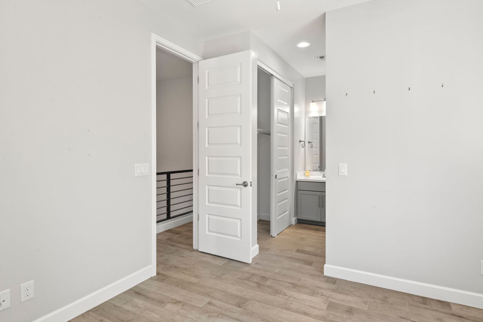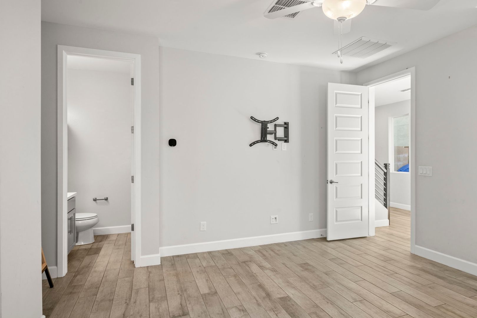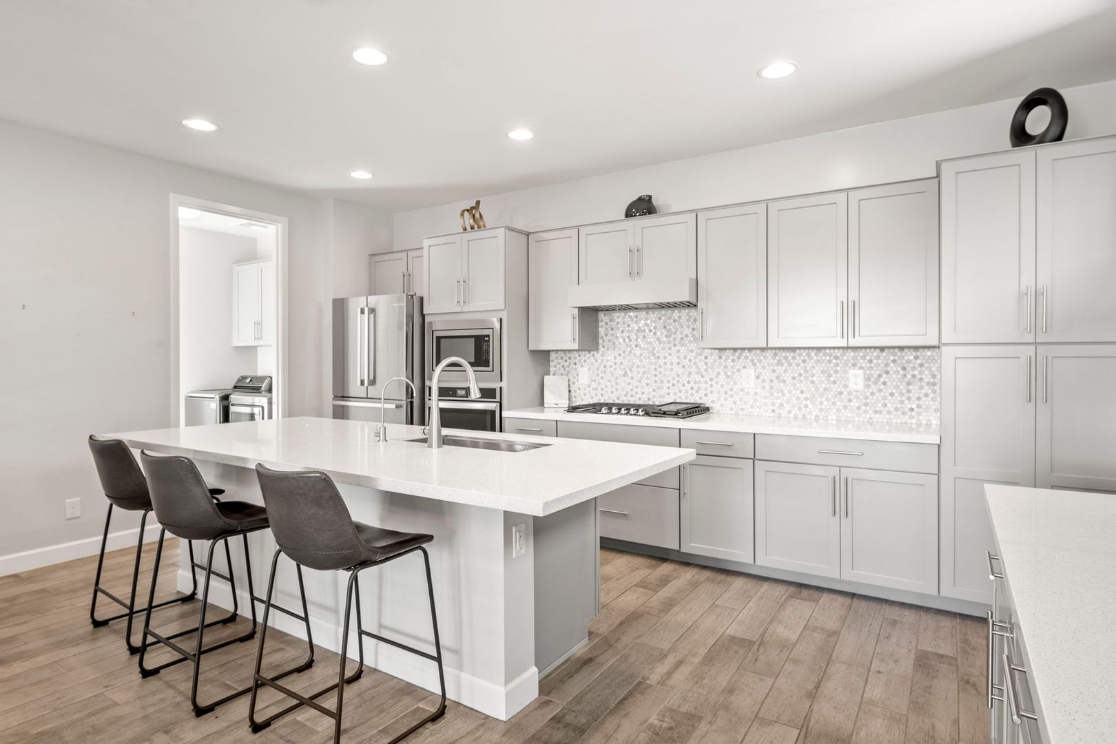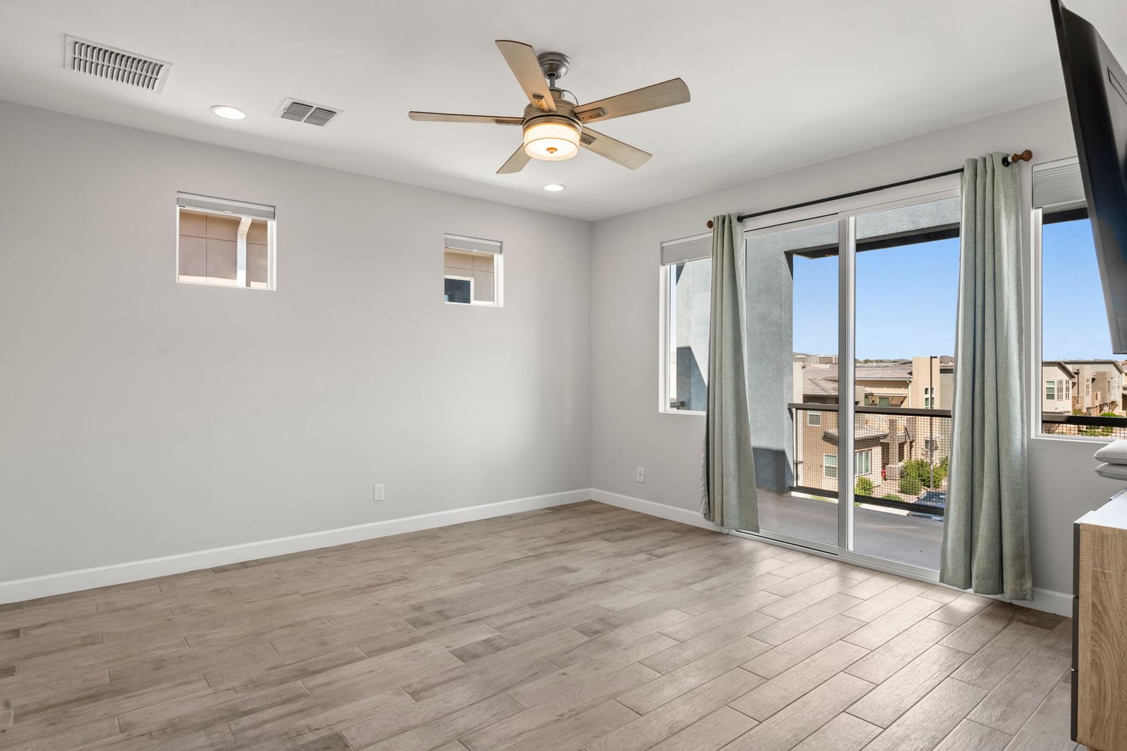 This gorgeous 3 Bedroom, 3.5 Bath home is located in the resort style gated Rhythm Community. The home faces the park, has natural light & modern features, is completely customized with NO CARPET, 9 foot doors, built in surround sound in the living room, and built in speakers, fans and lights on the balcony. The kitchen boasts high end appliances and a custom oversized island. The primary bedroom 's luxurious en suite bathroom features a complete tile shower with a rainfall feature. The in law suite has murphy bed and built in desk. The garage has overhead storage and is pre-wired for 220V EV chargers. Private backyard w/ faux grass, built in fireplace & easy care landscape. Community has heated pool, spa and workout facility. Easy access to shopping and fwy. Please call for pets.
